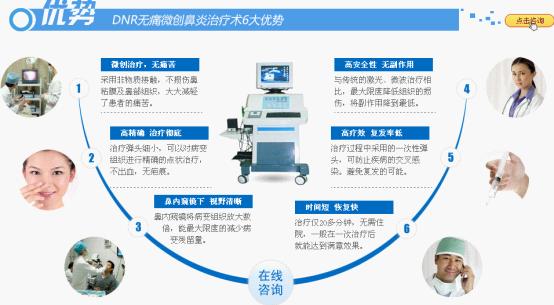 “DNR等离子技术”是 卫生组织公认的选择治疗鼻炎的方法之一,该技术是在鼻内窥镜宽阔的视野下,运用等离子低温消融系统的等离子能量,直接 从鼻、咽喉内病灶内部以较低的温度瞬间对引起鼻炎的增生组织进行消融,使发炎、增生等病变组织自行收缩、化解。该技术可保留局部黏膜组织结构的完整,并可 改善和恢复鼻腔黏膜形态及生理功能。大大减轻了病人痛苦和缩短治疗周期,不影响上班族、学生患者正常工作学习。