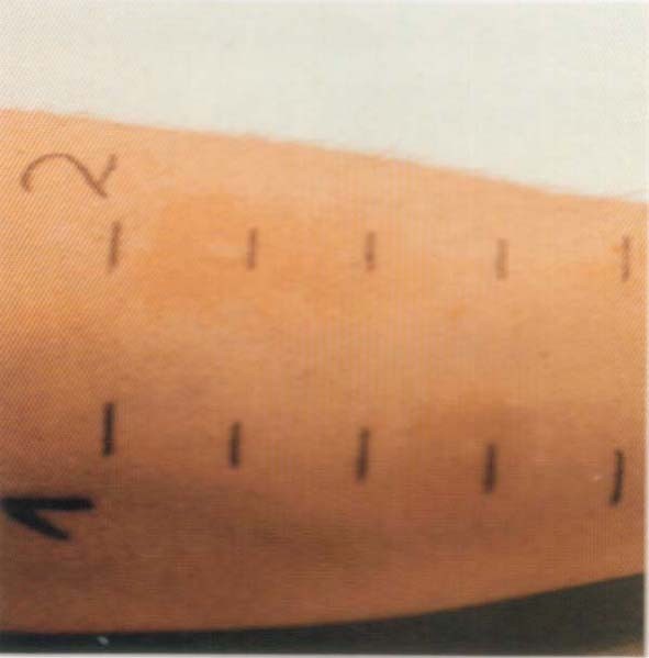 (6)结果评定:以组胺为标准,组胺引起的皮丘不论大小为+++,比组胺大的皮丘或有伪足为++++,与组胺等大的皮丘为+++,比组胺小的皮丘为++,至+,阴性为Ø/(-)。