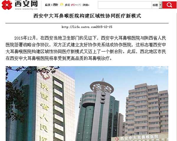 2015年12月,在西安当地卫生部门的见证下,西安新城中大耳鼻喉医院与陕西省医院签署战略合作协议,双方正式建立友好协作关系结成协作医院,这标志着西安新城中大耳鼻喉医院构建区域性协同医疗新模式又迈上了一个新台阶。此后,西北地区市民在西安新城中大耳鼻喉医院将享受到更高品质的耳鼻喉诊疗。