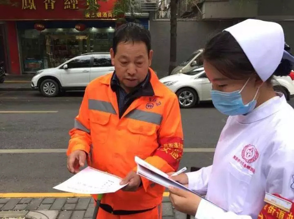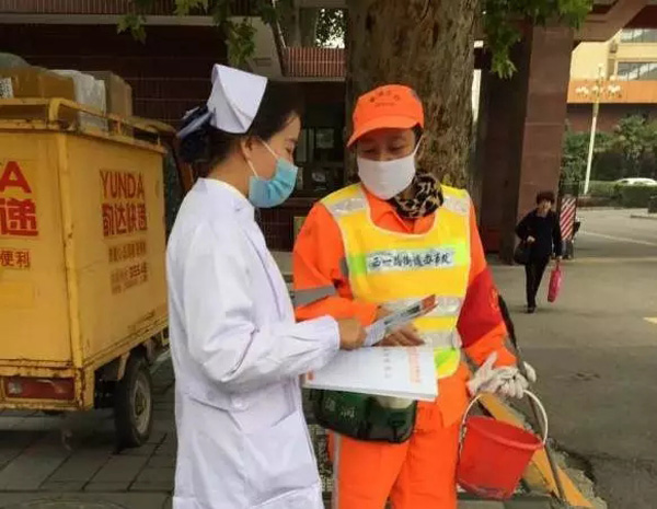 ▲西一路环卫孙大姐正在认真了解西安中大眼耳鼻喉医院的健康扶贫政策